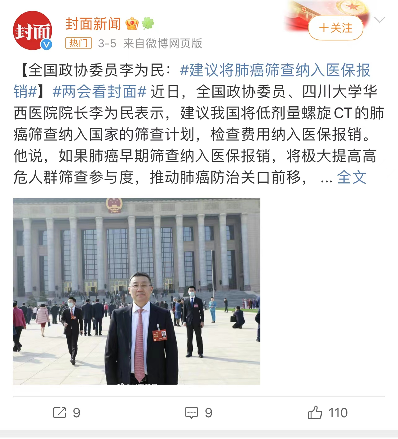 今年两会,全国政协委员、四川大学华西医院院长李为民教授带来一份《关于肺癌筛查纳入医保报销的提案》,他建议:将低剂量螺旋CT的肺癌筛查纳入国家的筛查计划,检查费用纳入医保报销。