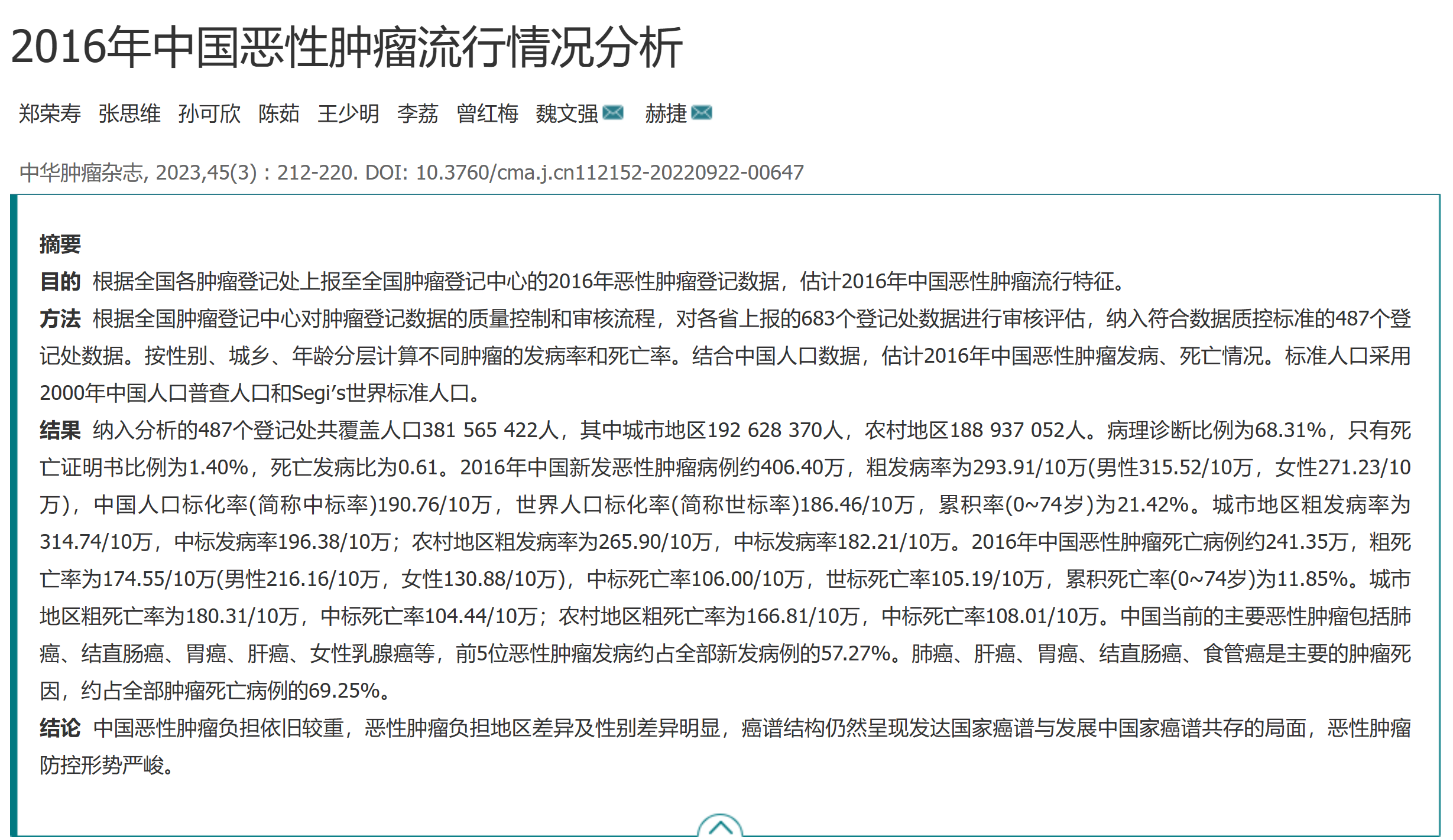[1]郑荣寿, 张思维, 孙可欣, 等. 2016年中国恶性肿瘤流行情况分析 [J] . 中华肿瘤杂志, 2023, 45(3) : 212-220.