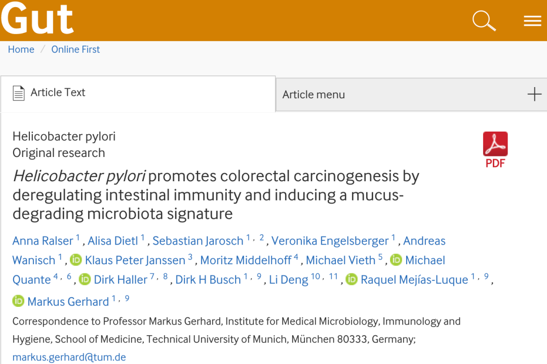 [1].Ralser A, Dietl A, Jarosch S, et al. Helicobacter pylori promotes colorectal carcinogenesis by deregulating intestinal immunity and inducing a mucus-degrading microbiota signature. Gut. 2023. doi:10.1136/gutjnl-2022-328075