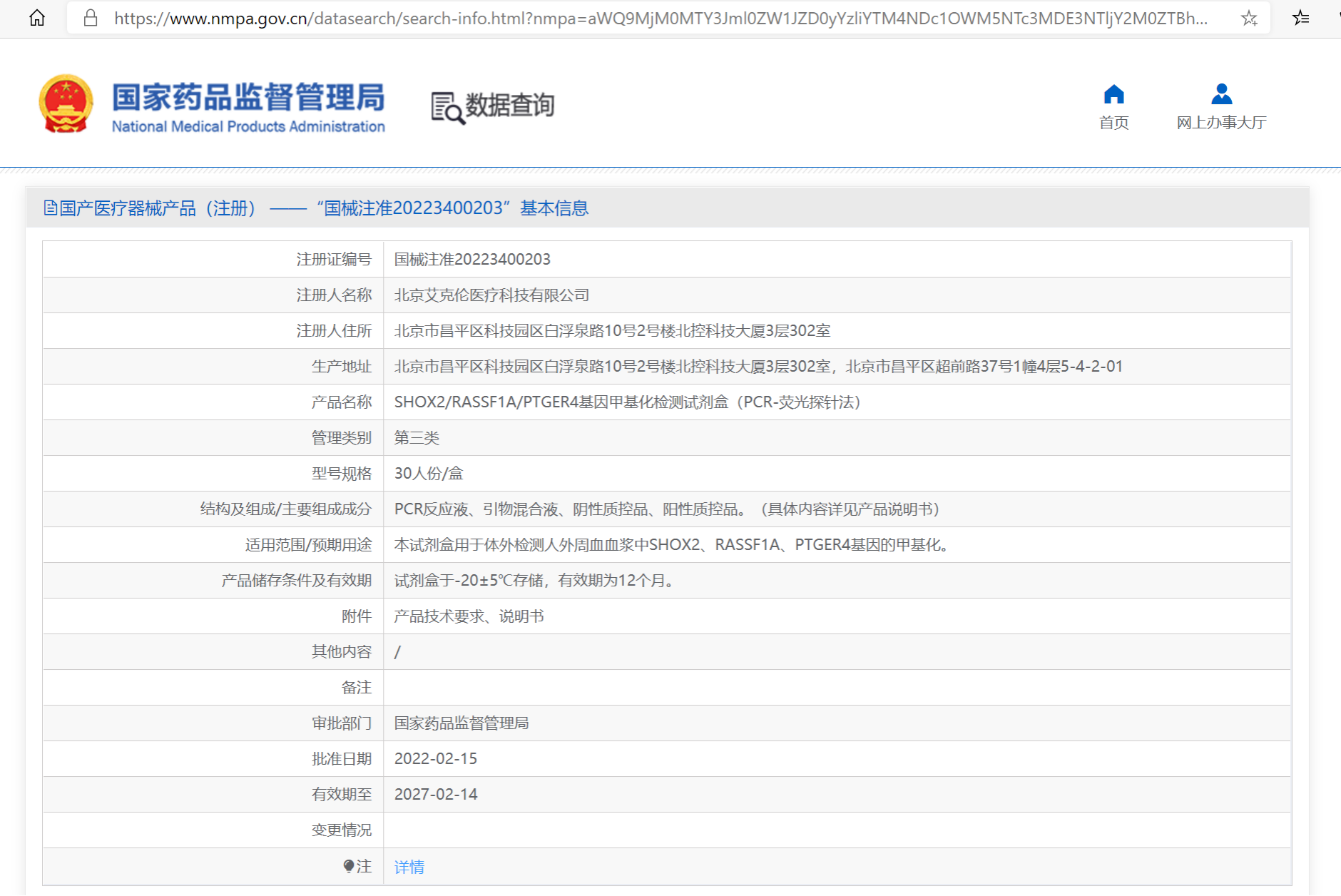 2022年2月25日, 国家药品监督管理局(NMPA)批准北京艾克伦医疗科技有限公司基于血浆的“SHOX2/RASSF1A/PTGER4基因甲基化检测试剂盒(PCR荧光探针法)”III类医疗器械产品艾肺明上市【4】。这是全球首款肺癌三基因甲基化检测产品,此次批准也证实了基于血浆ctDNA甲基化的检测在肿瘤早筛领域得到了认可,具有重大的研究前景。
