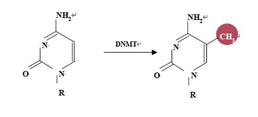 DNA甲基化是指基因组胞嘧啶-鸟嘌呤二核苷酸(CpG)上的5位碳原子,在DNA甲基转移酶家族(DNMTs,DNMT1、DNMT3a和DNMT3b)的介导下,共价结合一个游离的甲基形成5-甲基胞嘧啶的过程[2]。