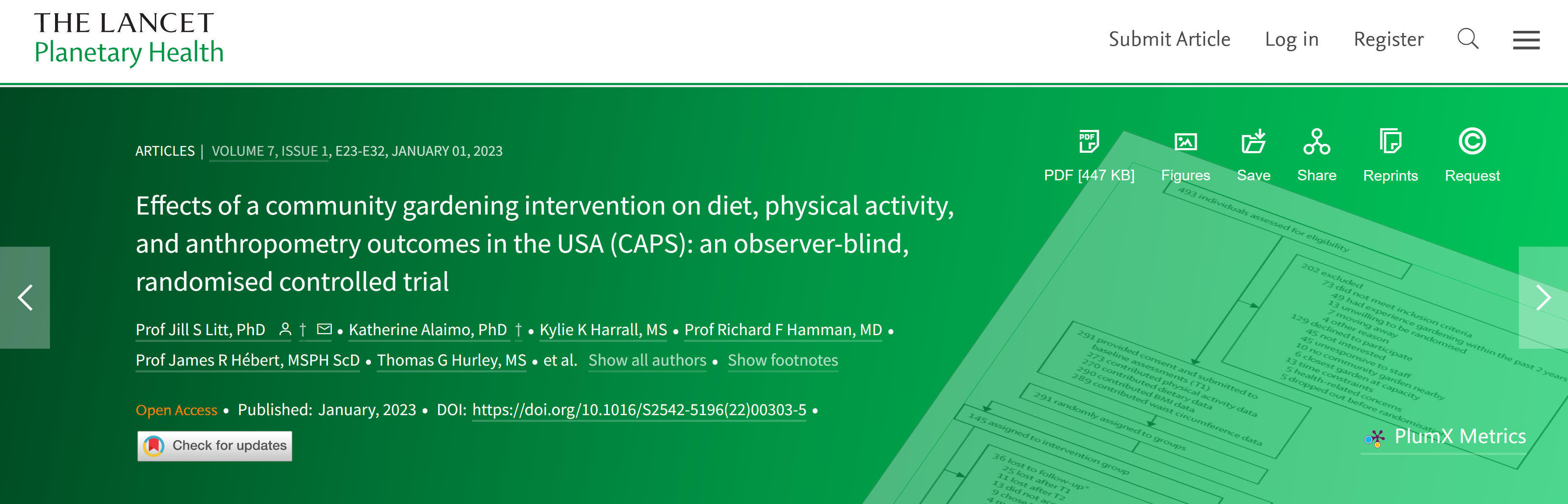 1、Litt JS, Alaimo K, Harrall KK, Hamman RF, Hébert JR, Hurley TG, Leiferman JA, Li K, Villalobos A, Coringrato E, Courtney JB, Payton M, Glueck DH. Effects of a community gardening intervention on diet, physical activity, and anthropometry outcomes in the USA (CAPS): an observer-blind, randomised controlled trial. Lancet Planet Health. 2023 Jan;7(1):e23-e32.