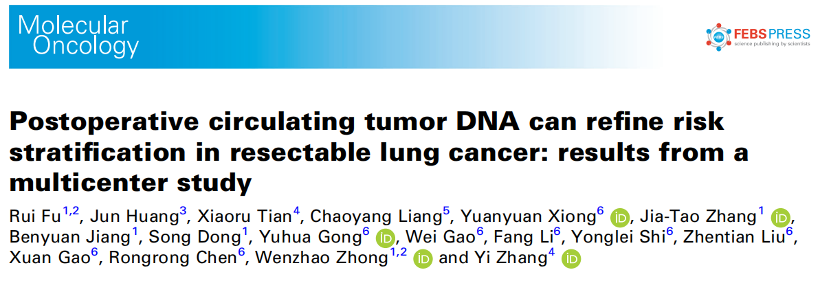 [1] Fu R, Huang J, Tian X, Liang C, Xiong Y, Zhang JT, Jiang B, Dong S, Gong Y, Gao W, Li F, Shi Y, Liu Z, Gao X, Chen R, Zhong W, Zhang Y. Postoperative circulating tumor DNA can refine risk stratification in resectable lung cancer: results from a multicenter study. Mol Oncol. 2023 Feb 2. doi: 10.1002/1878-0261.13387. Epub ahead of print. PMID: 36732646.